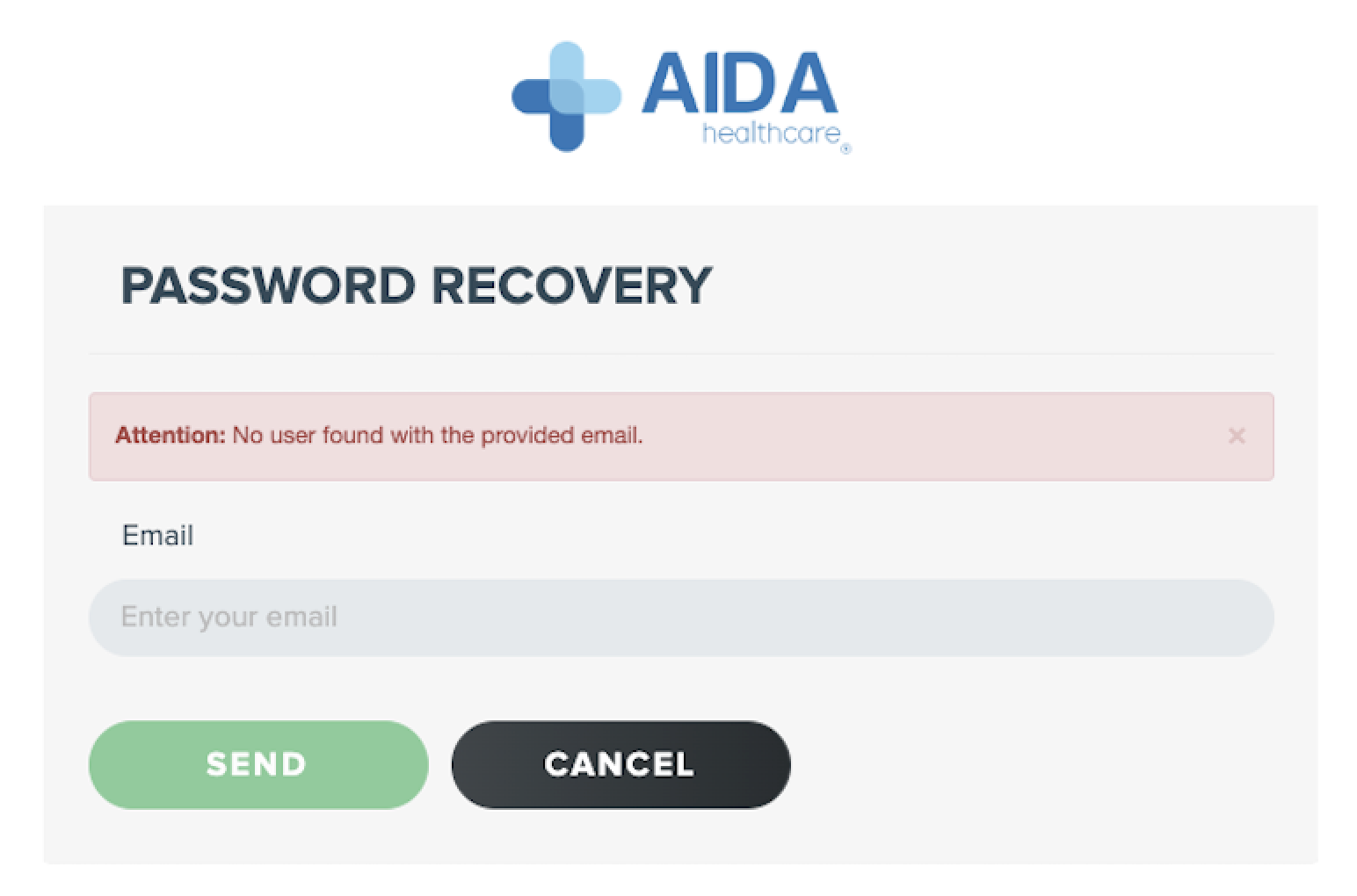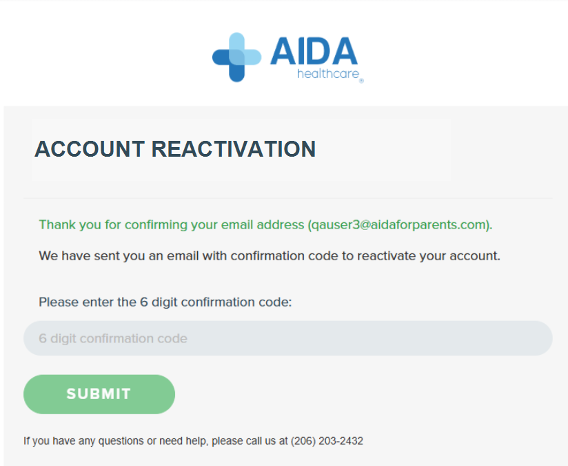 If you attempt to log into AIDA after a certain amount of time has passed without a login, you may need to reactivate your account. When you log in with the correct email and password, you may see this screen asking for a reactivation code.